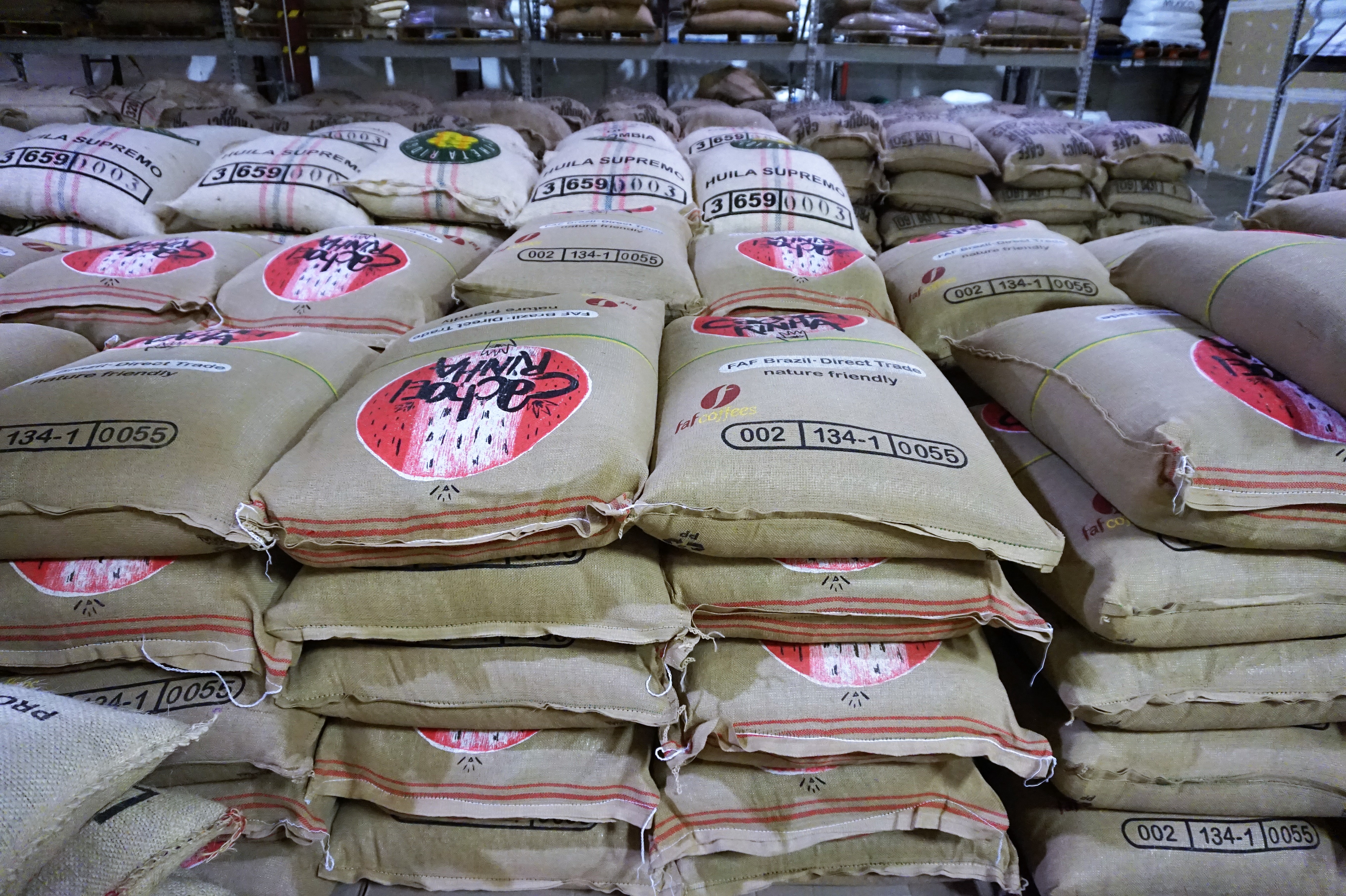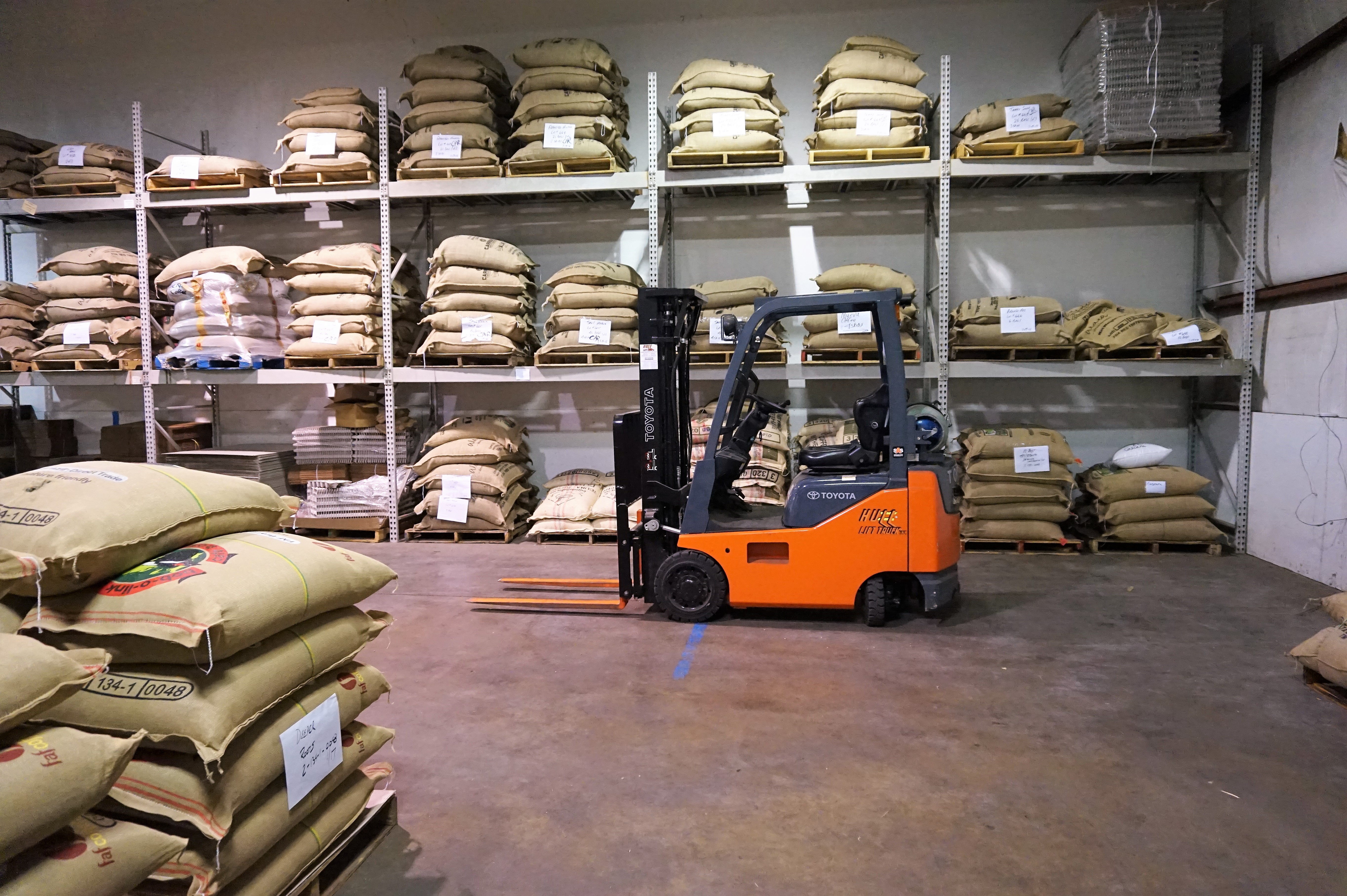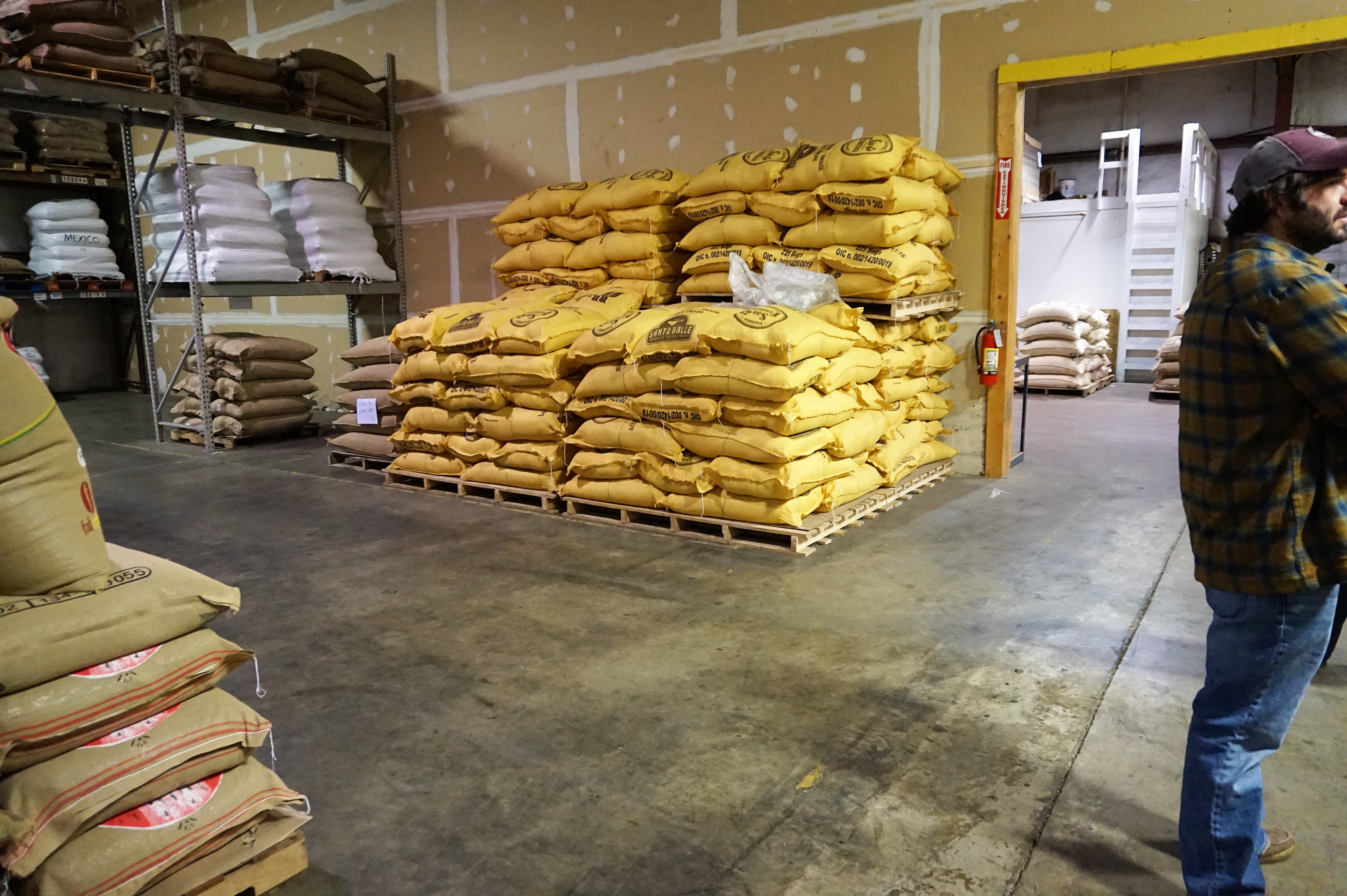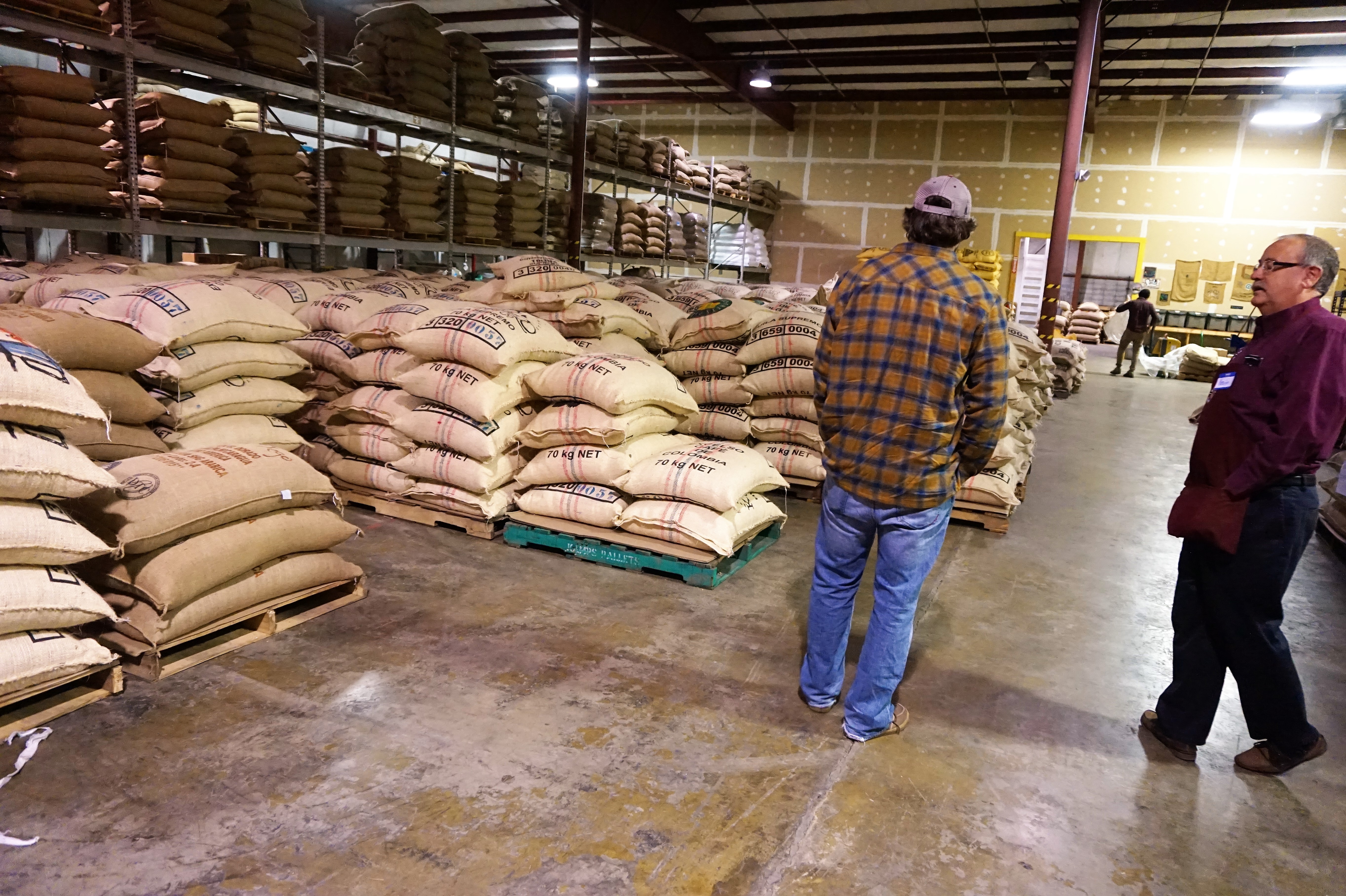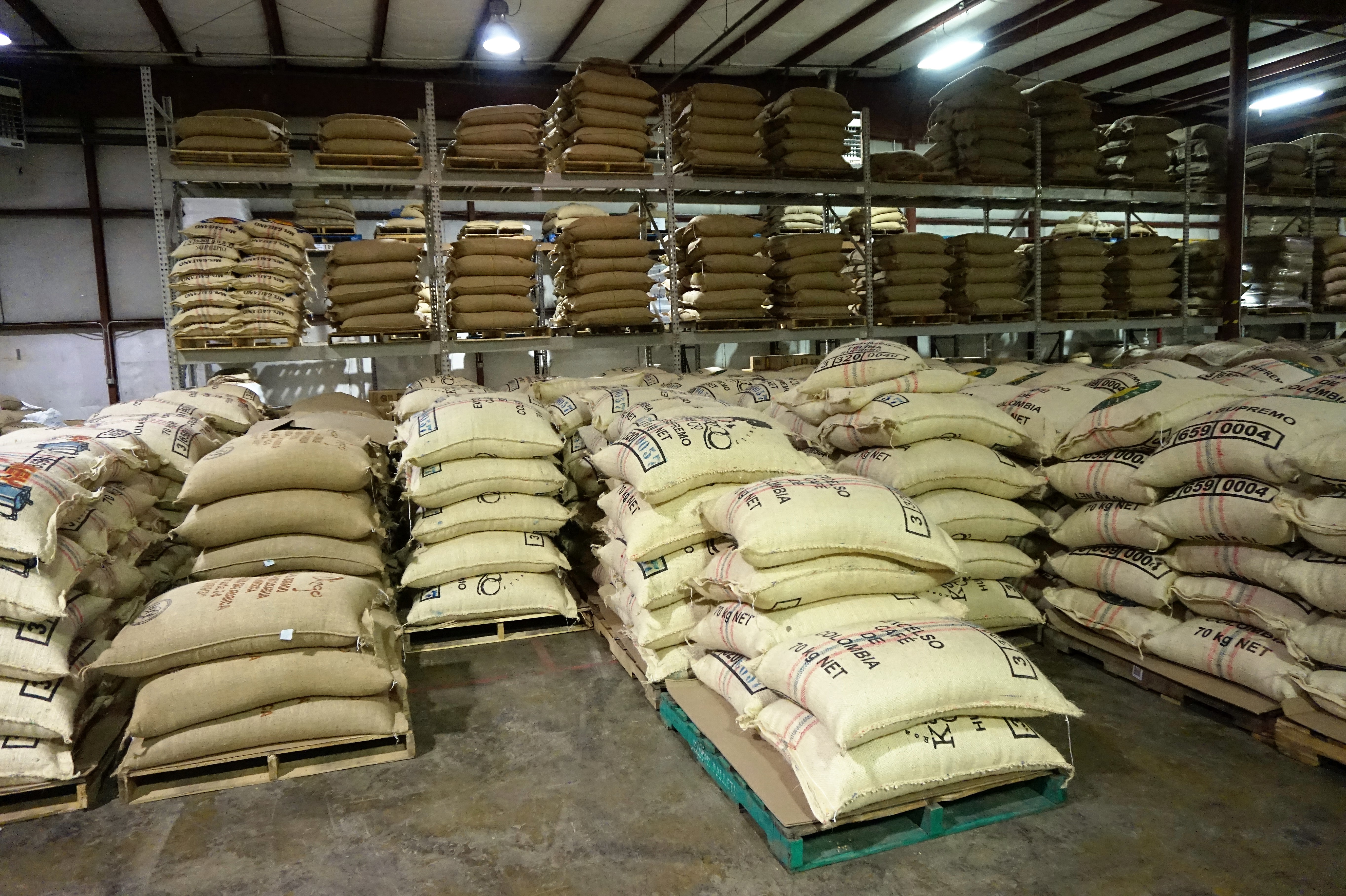 In the back of the facility, about 60 different varieties of beans are stashed atop the concrete.