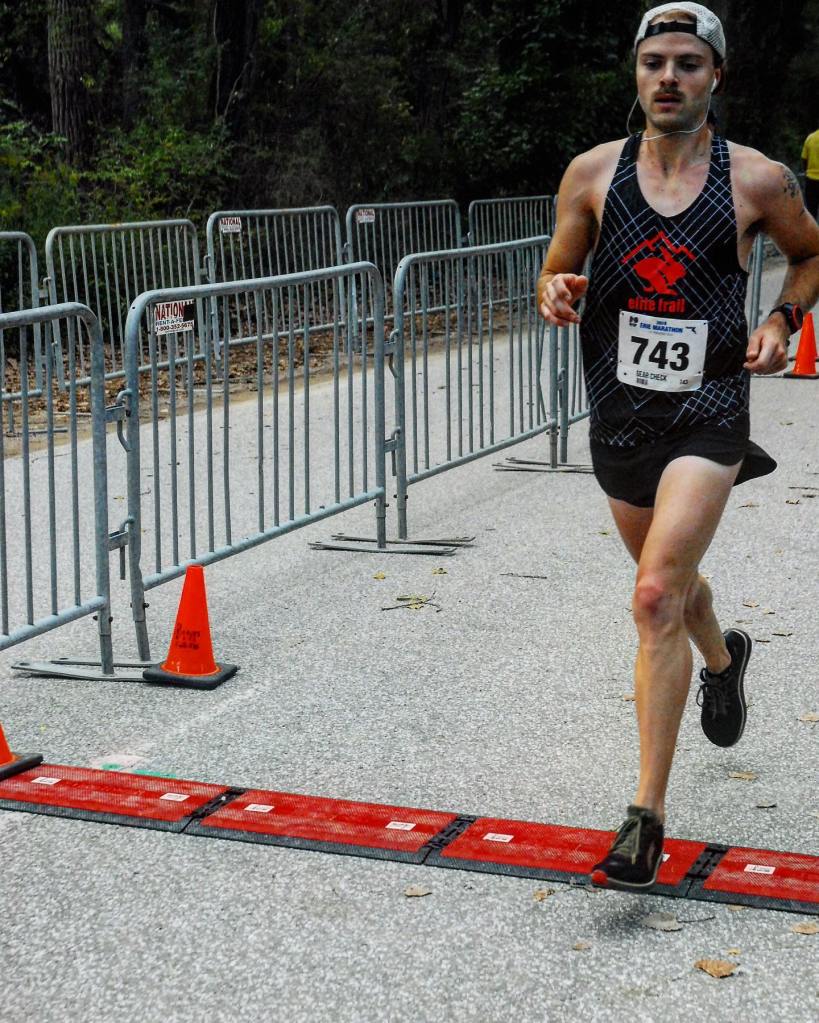 I ended up splitting a 4:57 mile somewhere along that dirt road descent, and was closing in on the finish. My time was solid, as I checked my watch and knew I’d be just under 1:45 if I kept the pace up. In my mind, I had won the race easily.